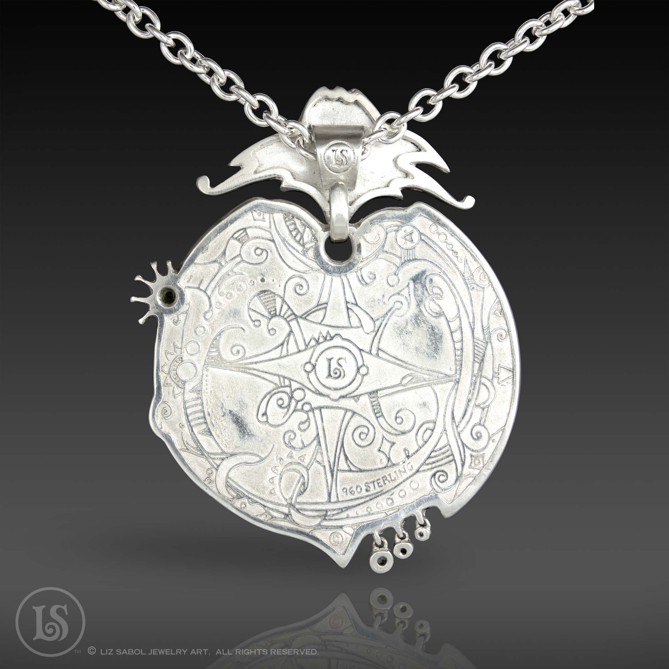 This pendant was featured in a Cool Tools article about my design process. This pendant is hand-crafted in 960 sterling silver metal clay, hand-painted and filled with resin.  The resin is sanded flush and re-polished.   Amethyst, Peridot, and Cubic Zirconia gems. It is a large and heavy statement piece.