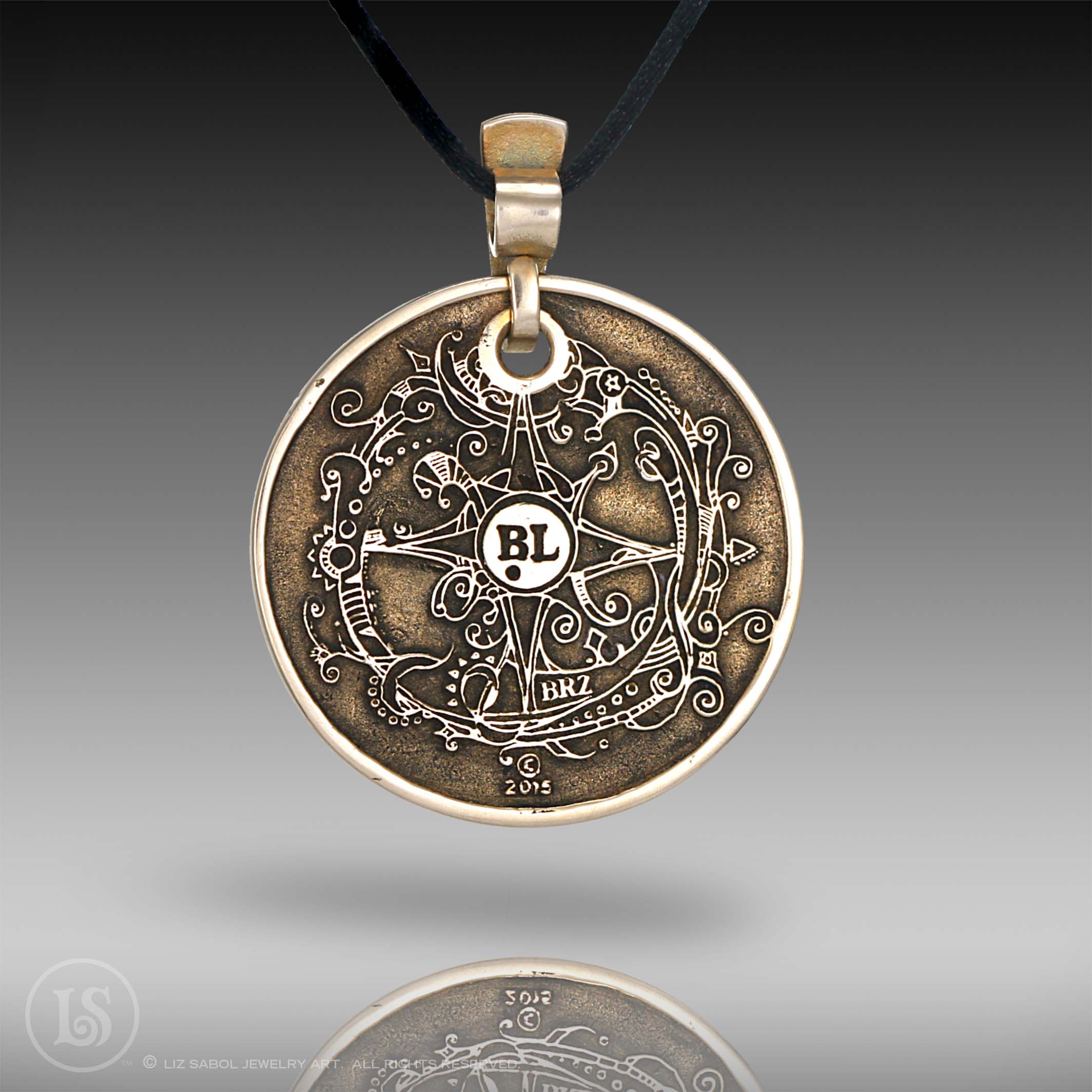 This bronze pendant is hand-crafted in bronze metal clay, hand-painted and filled with resin. The resin is sanded flush and re-polished.