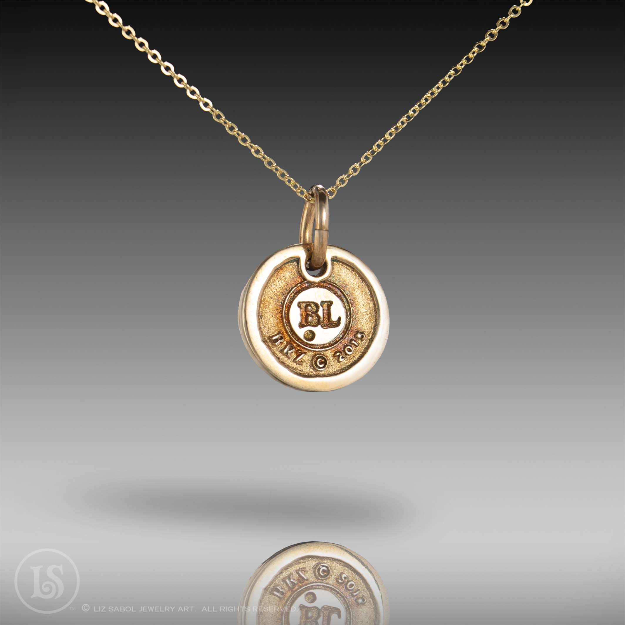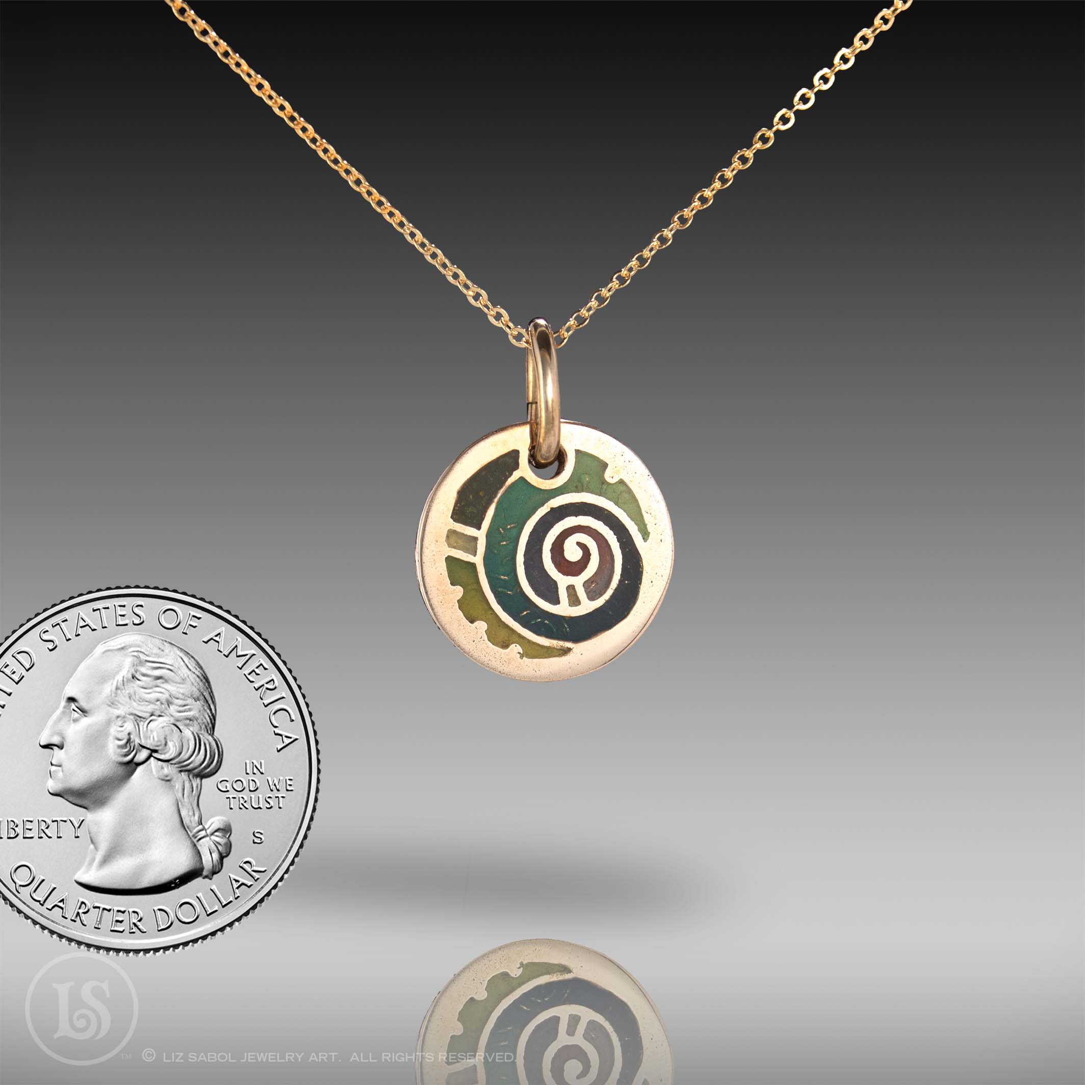 This bronze pendant is hand-crafted in bronze metal clay, hand-painted and filled with resin. The resin is sanded flush and re-polished.