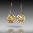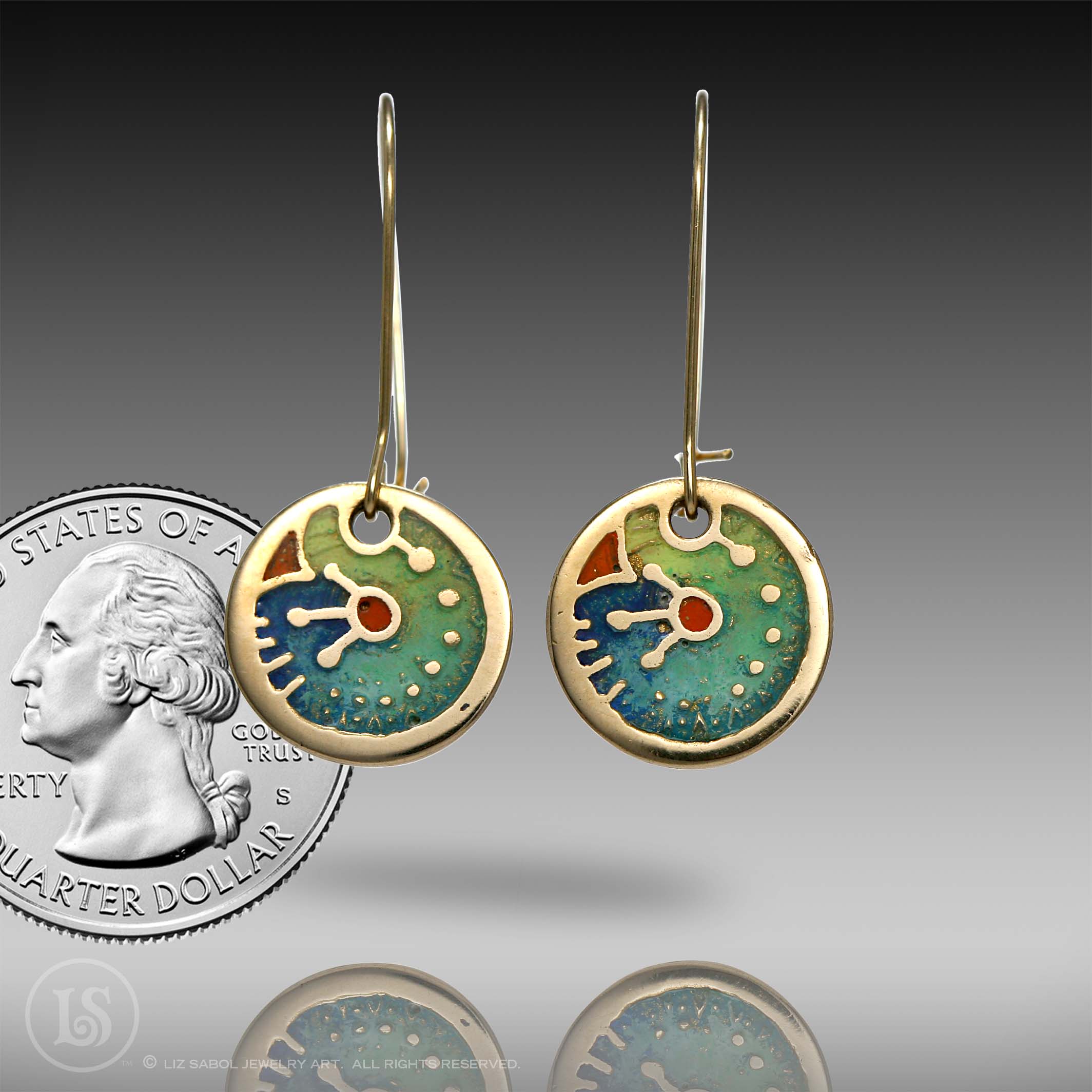 These earrings are hand-crafted in bronze metal clay, hand-painted and filled with resin. The resin is sanded flush and re-polished.