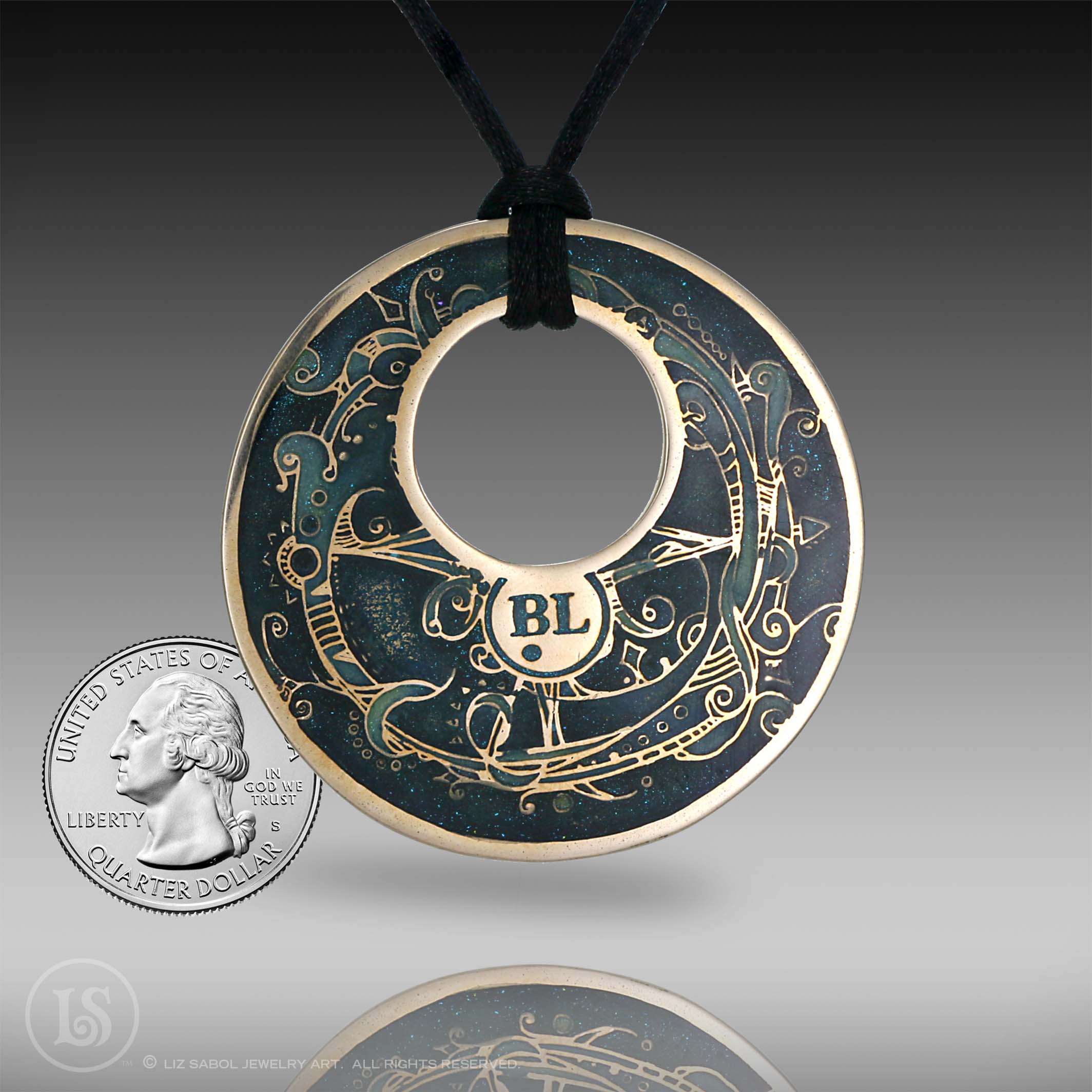 This pendant is hand-crafted in bronze metal clay, hand-painted and filled with resin. The resin is sanded flush and re-polished.