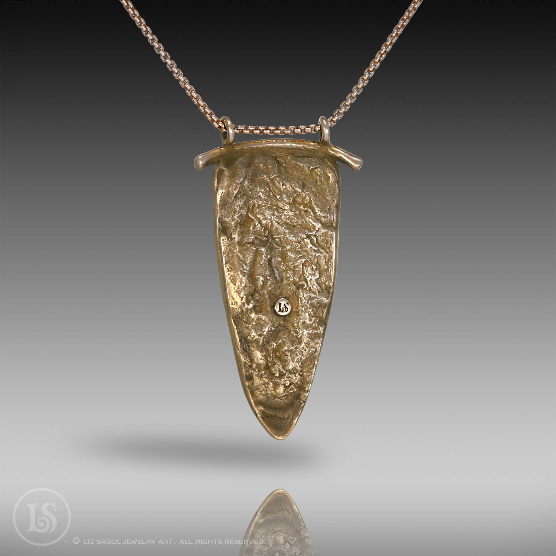 This bronze pendant is hand-crafted in bronze metal clay, hand-painted and filled with resin.  The resin is sanded flush and re-polished.