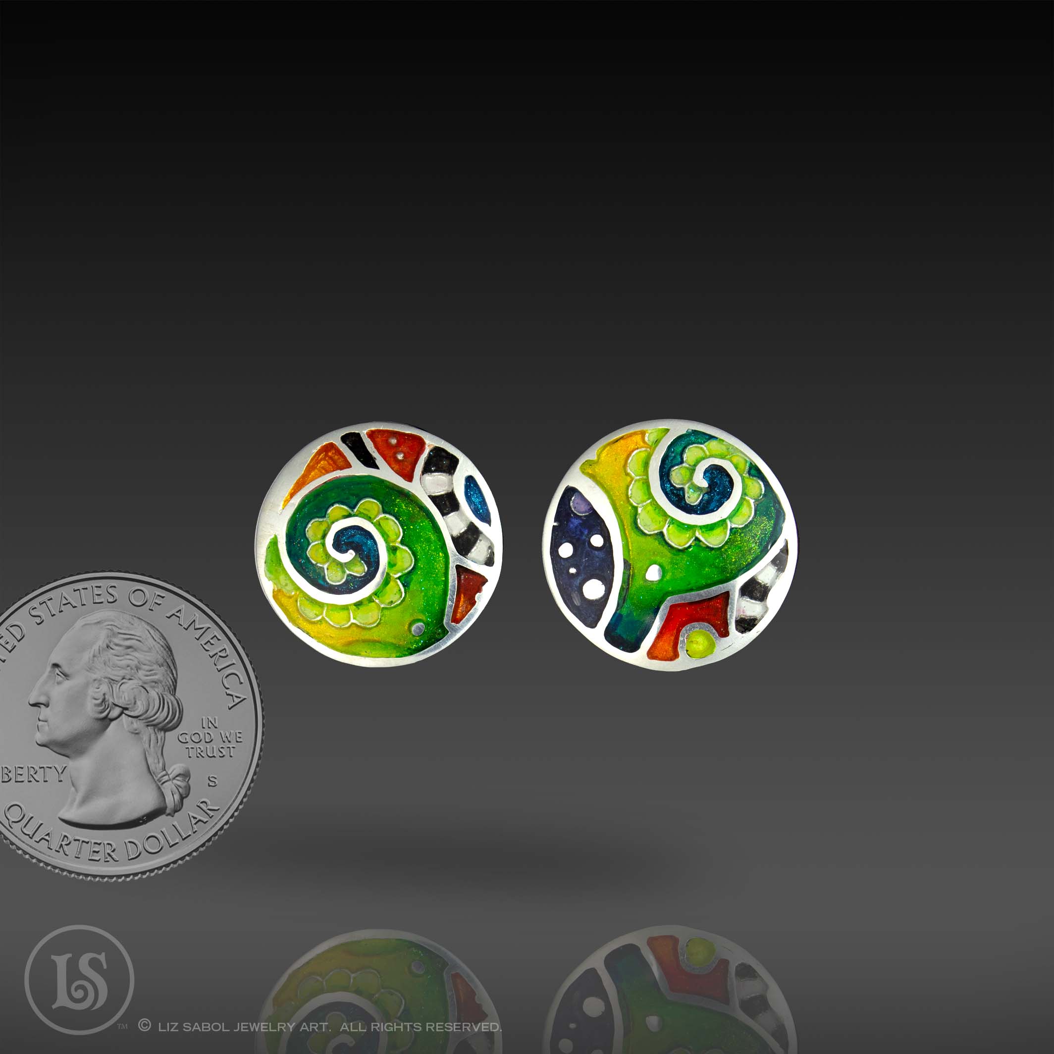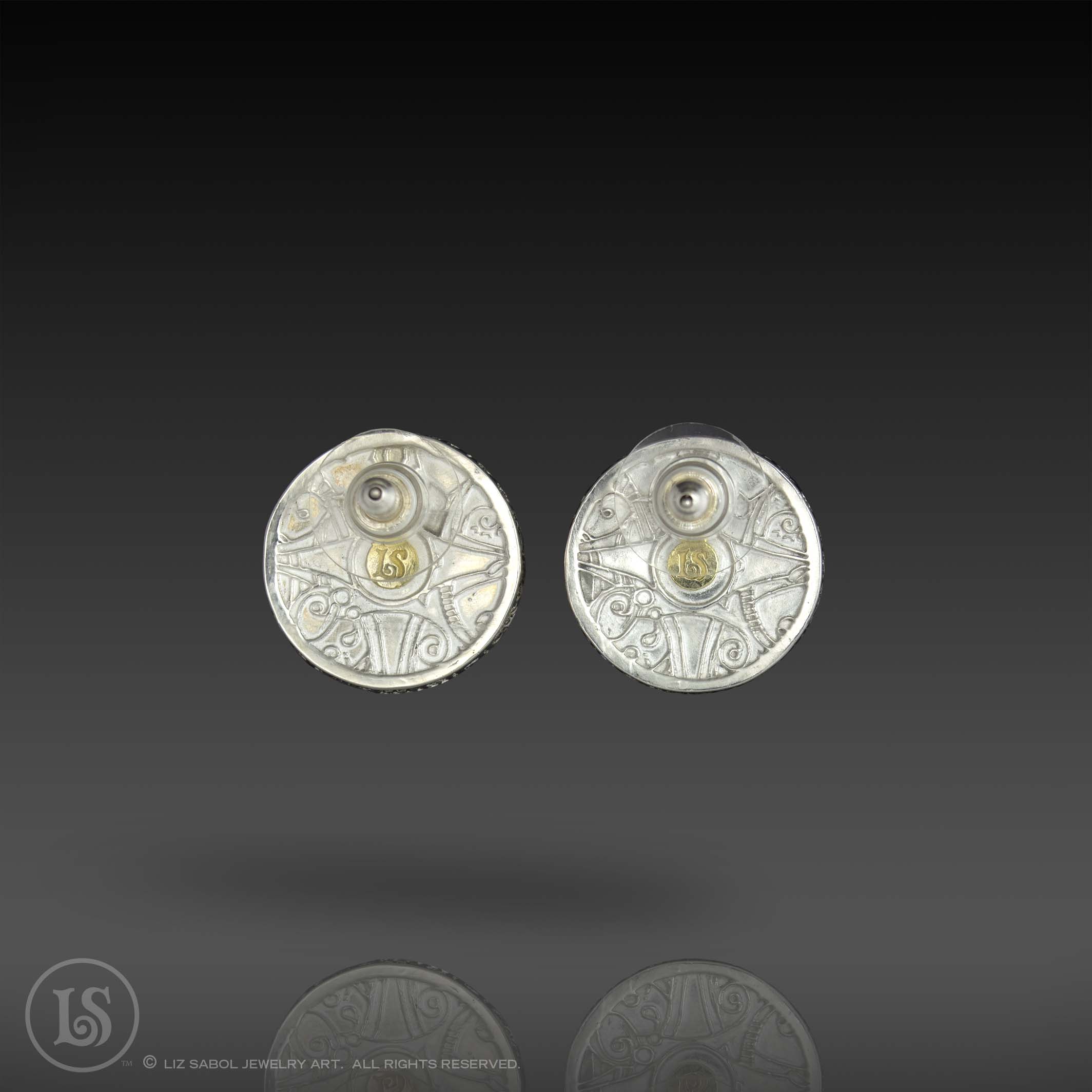I made these earrings as an example for a master class I teach. It is hand-crafted in 960 sterling silver metal clay, 22K gold accents, hand-painted and filled with resin. The resin is sanded flush and re-polished.