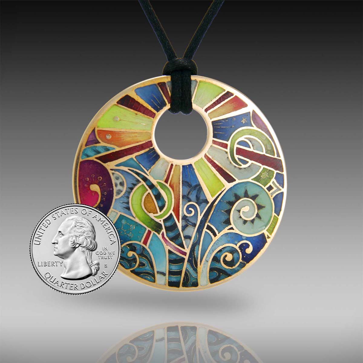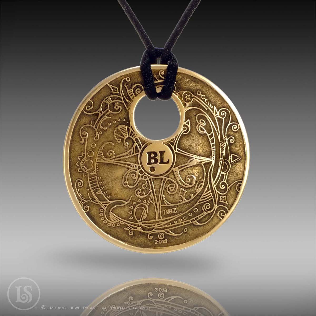 This pendant is hand-crafted in bronze metal clay, hand-painted and filled with resin. The resin is sanded flush and re-polished.