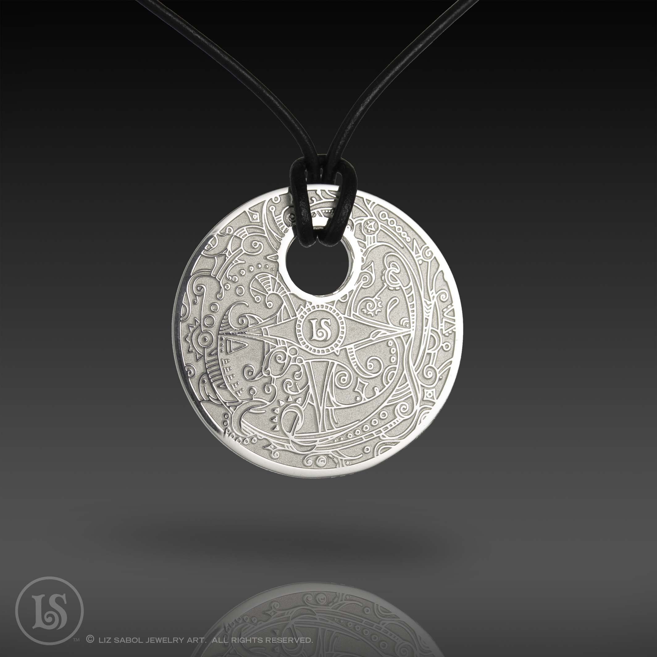 Solid sterling silver pendant with my Celestial Sun design in deep relief. 18" Leather cord included. Polishing cloth included.