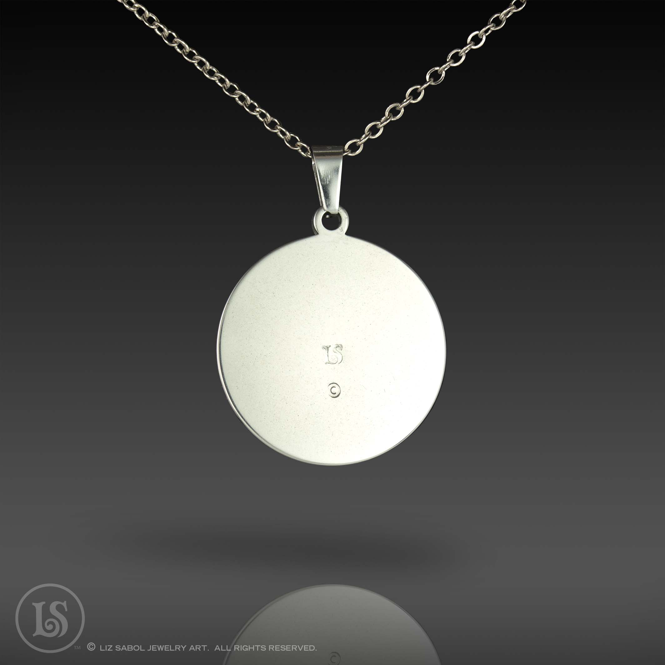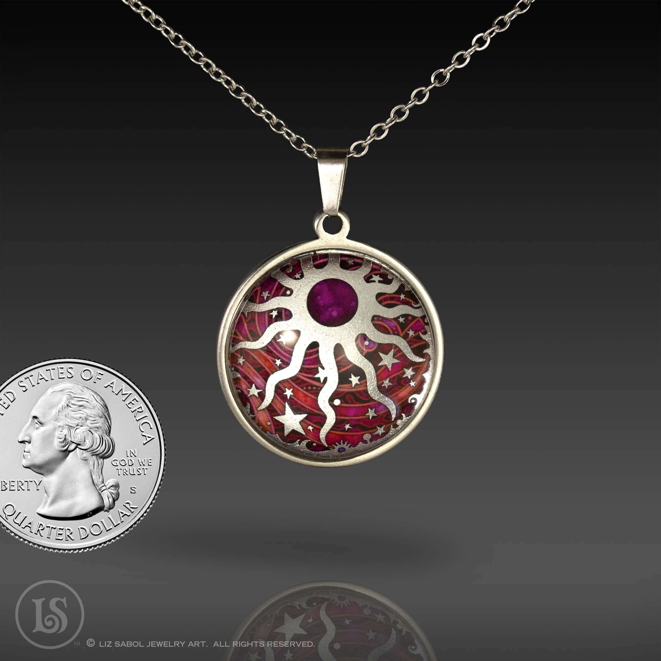 This is a high-quality reproduction in ink and foil of my popular handmade champleve Celestial Sun design, mounted on stainless steel and covered in solid glass. Affordable for everyone. Comes with a stainless steel chain.