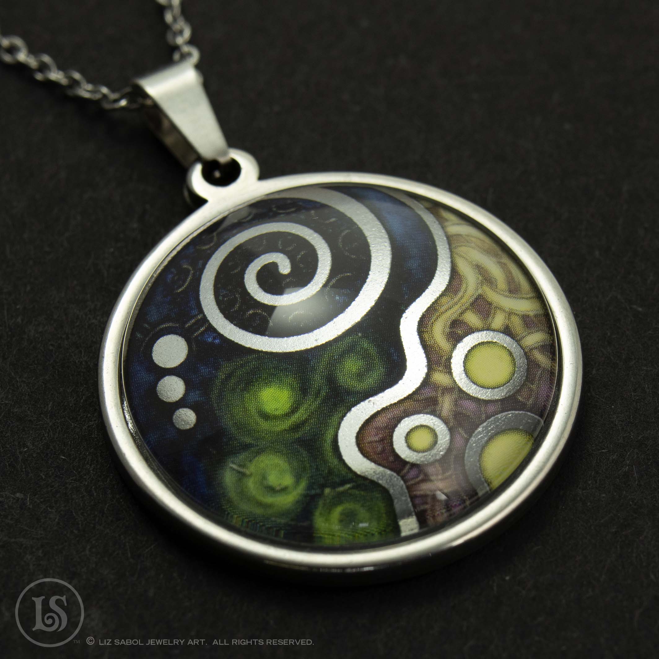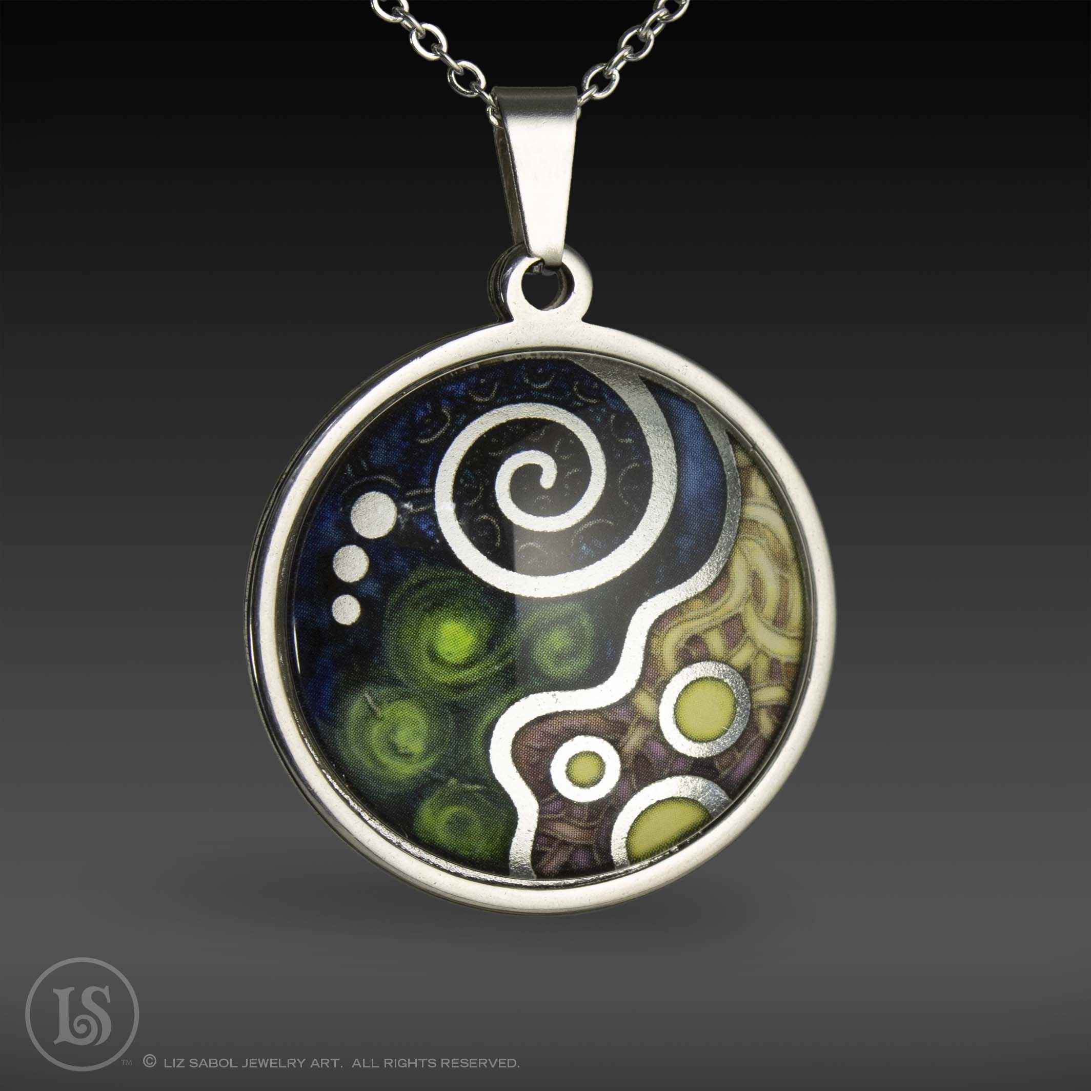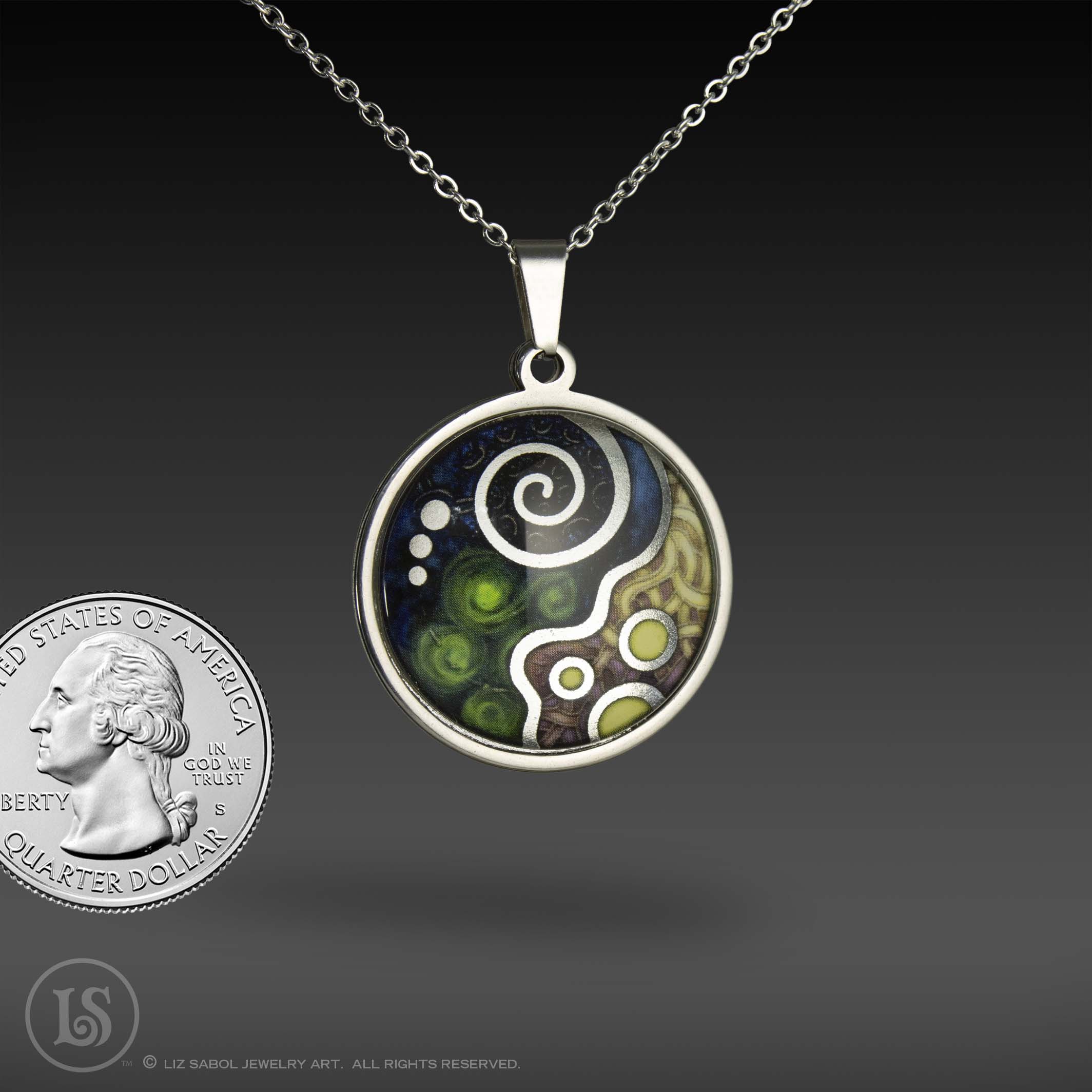 This pendant features a high-quality reproduction in ink and foil on paper of my popular award-winning, handmade champleve Jupiter collection, mounted on stainless steel and covered in solid glass. Affordable for everyone. Comes with a stainless steel chain. 28mm diameter.